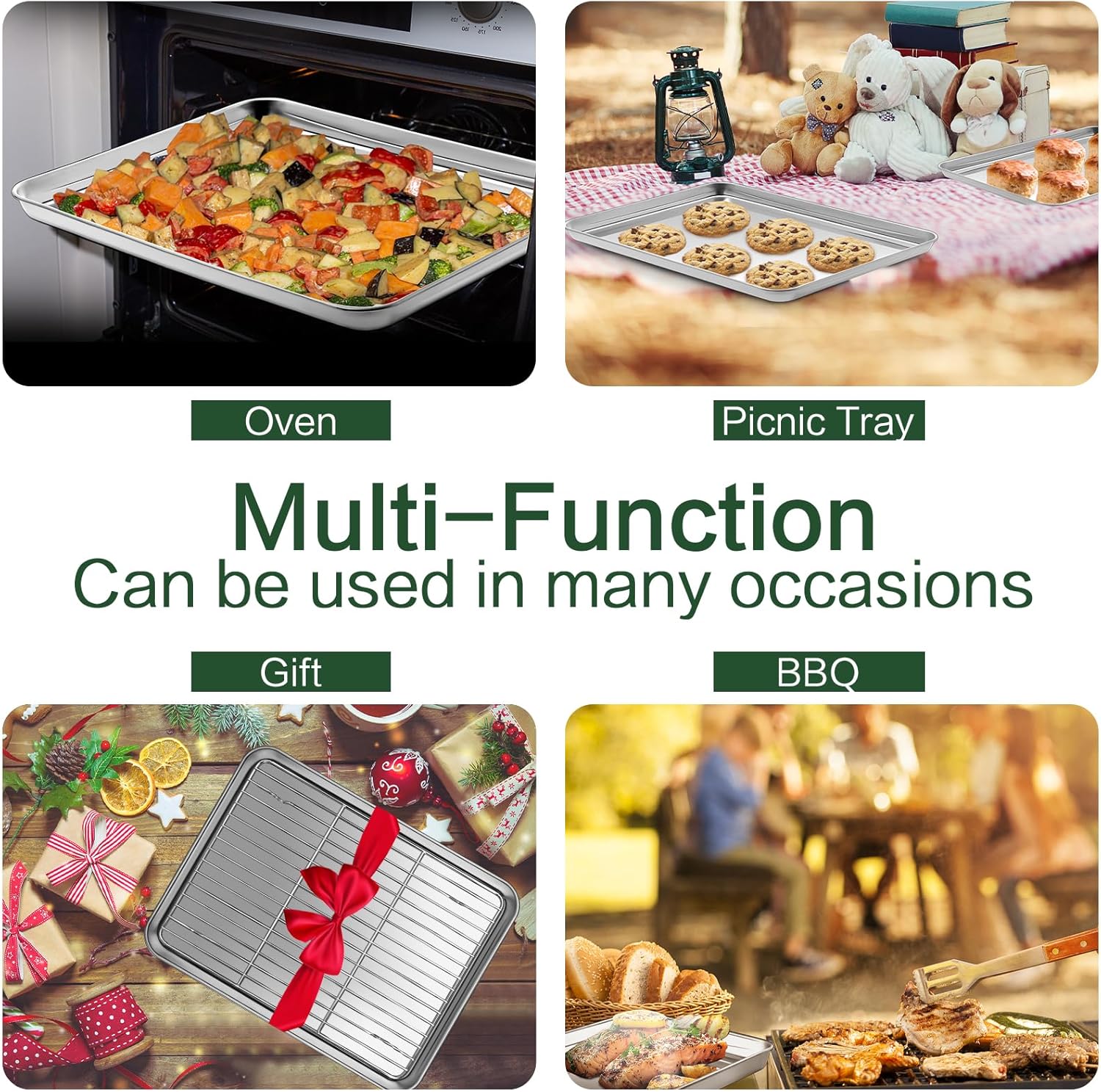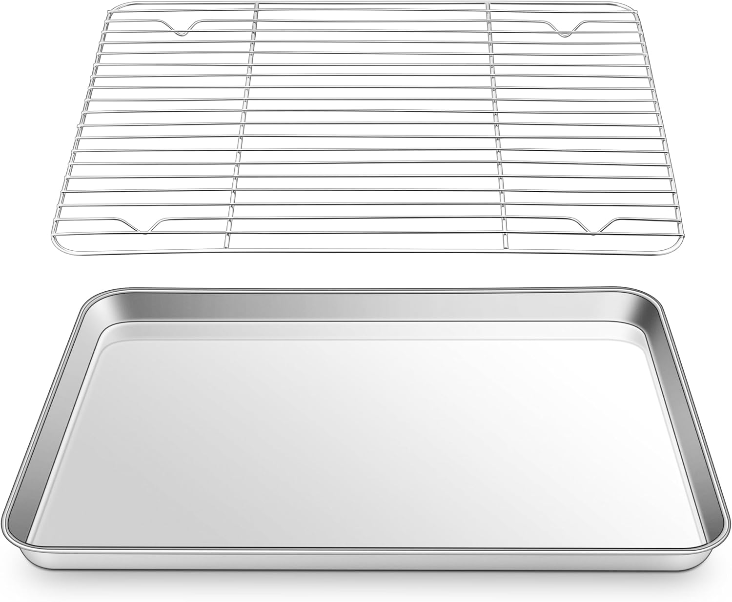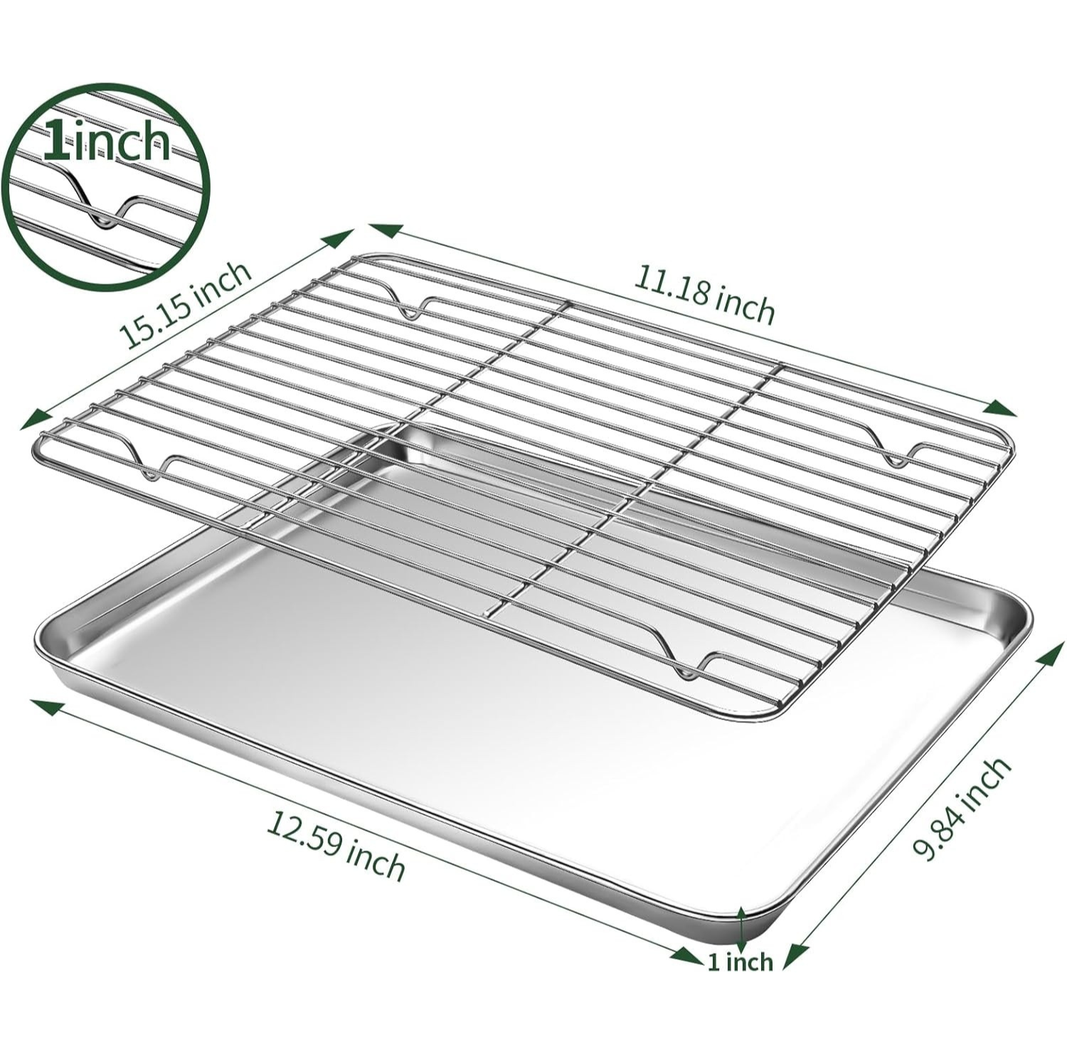 Well Crafted & Heavy Duty : The baking tray with wire rack comes with sturdy construction and reinforced edge, which prevents twisting and warping and heat up evenly reducing baking time. The baking pan has a mirror polish, reducing the risk of food adhesion. The smooth edge of the baking tray ensures your safety
